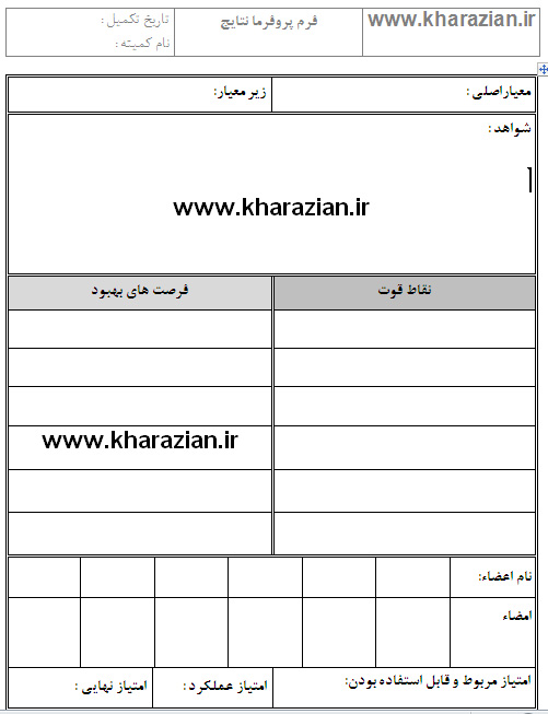 اطلاعات جمعآوری شده در جلسات کارگاه-پروفورما ارزیابی میشود ونقاط قوت و فرصتهای بهبود در هر زیر معیار در فرم پروفورما نتایج جمعبندی میشود.