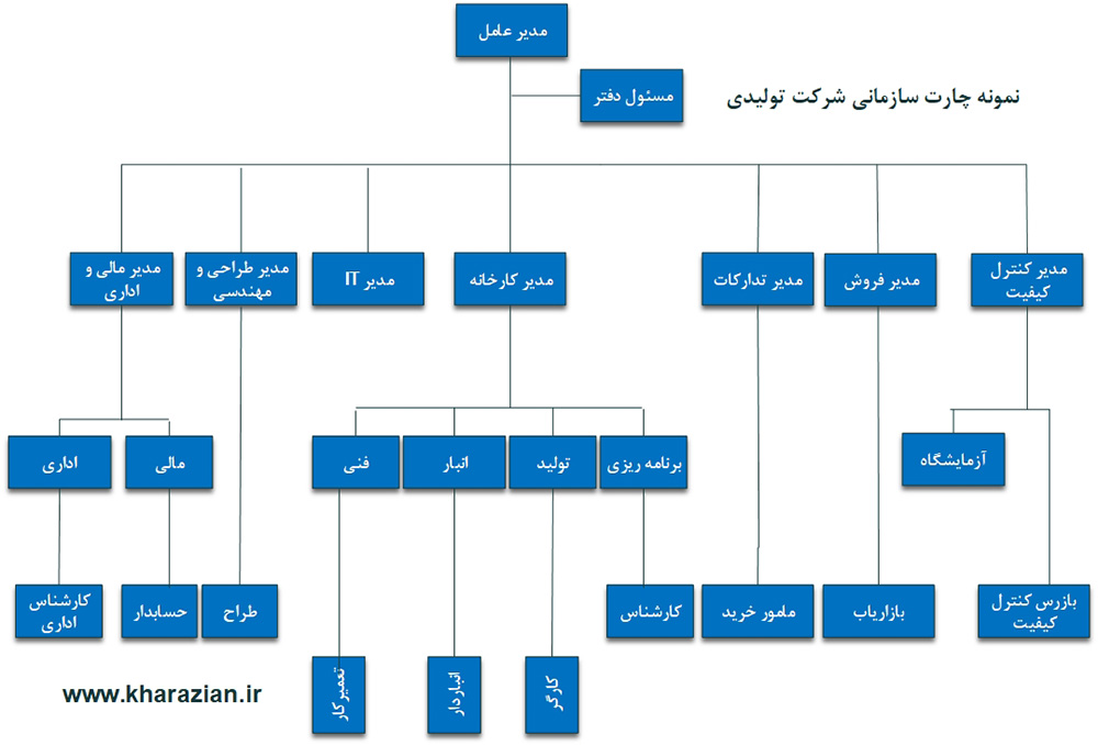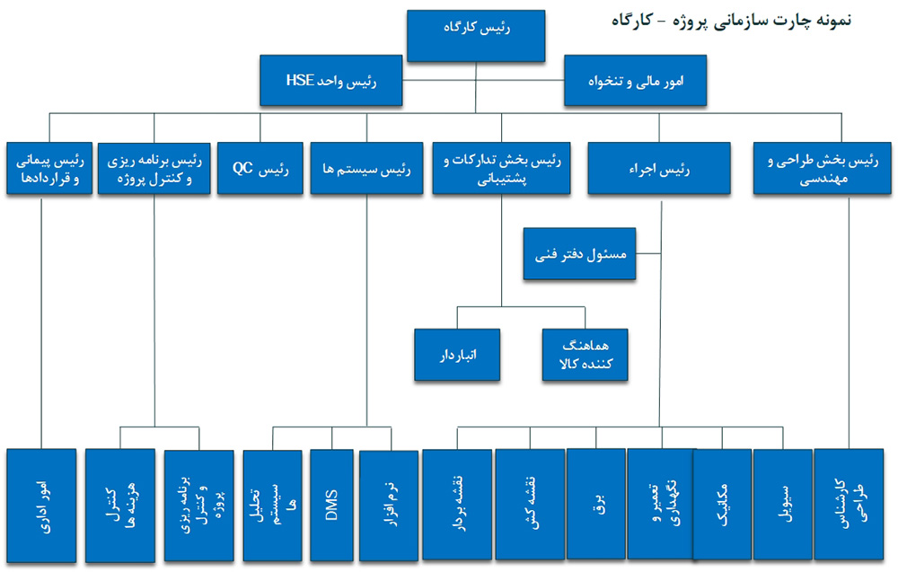 نمونه چارت سازمانی از انواع ساختار سازمانی میتواند به شما در تدوین نمودار سازمانی متناسب با سازمانتان کمک نماید در ادامه نمونه نمودار سازمانی شرکتهای تولیدی و پروژهای ارائهشده است .