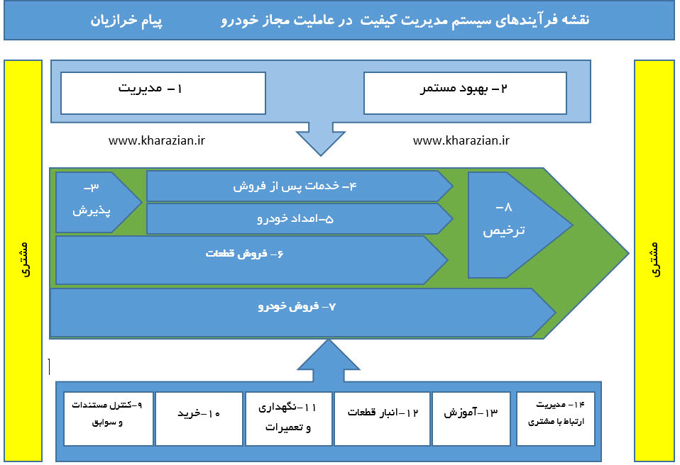 مهندس پیام خرازیان باتجربه زیاد در استقرار سیستمهای مدیریتی در نمایندگیهای مجاز خدمات پس از فروش خودرو هیوندایی ، کیا موتورز ، کرمان موتور ( اکثر این نمایندگیها دارای پذیرش بالا بودهاند) فرآیندهای موردنیاز در تعمیرگاه مجاز خدمات پس از فروش را به شرح زیر پیشنهاد میدهد.