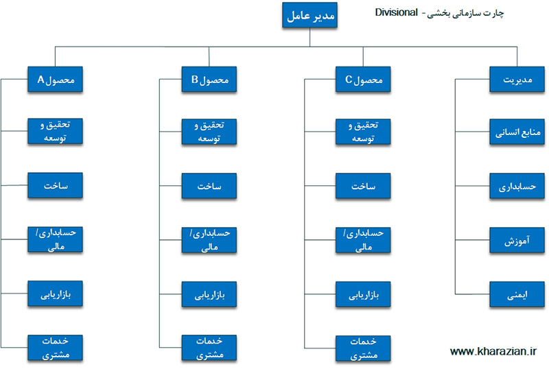 اغلب، بخشها بدون نیاز به تأیید دیگران سریعاً تصمیم مینمایند و .تقسیمبندی دپارتمانها بر اساس محصول، منطقهی جغرافیایی، مشتری و یا زمان( بهعنوانمثال شیفتهای کاری سازمان ) صورت میگیرد.