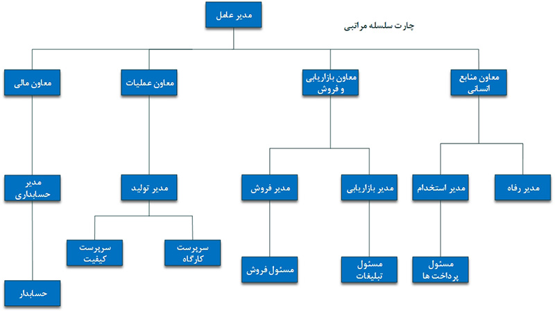 سلسلهمراتب و بوروکراسی زیاد از ویژگیهای این ساختار نمودار سلسله مراتبی است. میزان ارتباطات در این نوع ساختار محدود به سلسلهمراتب است و هر شخص تنها به مافوق خود گزارش میدهد.